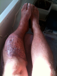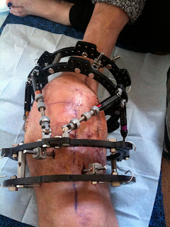 Here's a close-up of the 2 big pins nearest my knee. You can see that the wounds are still a bit open but there is no discharge - so far, so good. This area of my leg is all graft - muscle from my back and skin from my thigh. Remember that? Seems like ages ago now...